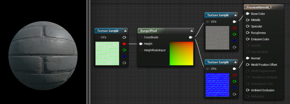 凹凸贴图偏移(BumpOffset) 是虚幻引擎4术语,就是通常所谓的"视差贴图"。BumpOffset表达式可以使材质产生深度错觉,而不需要额外的几何体。BumpOffset材质使用灰阶_高度贴图_来提供深度信息。高度贴图中的值越亮,材质的"凸出"效果越明显;当摄像机在表面上移动时,这些区域将产生视差(移位)。高度贴图中较暗的区域将显得"距离较远",其移位程度最小。